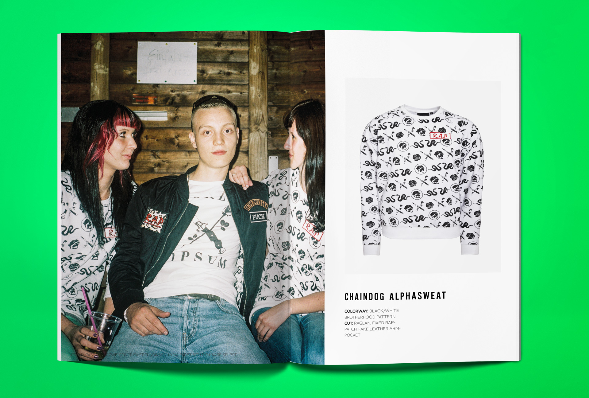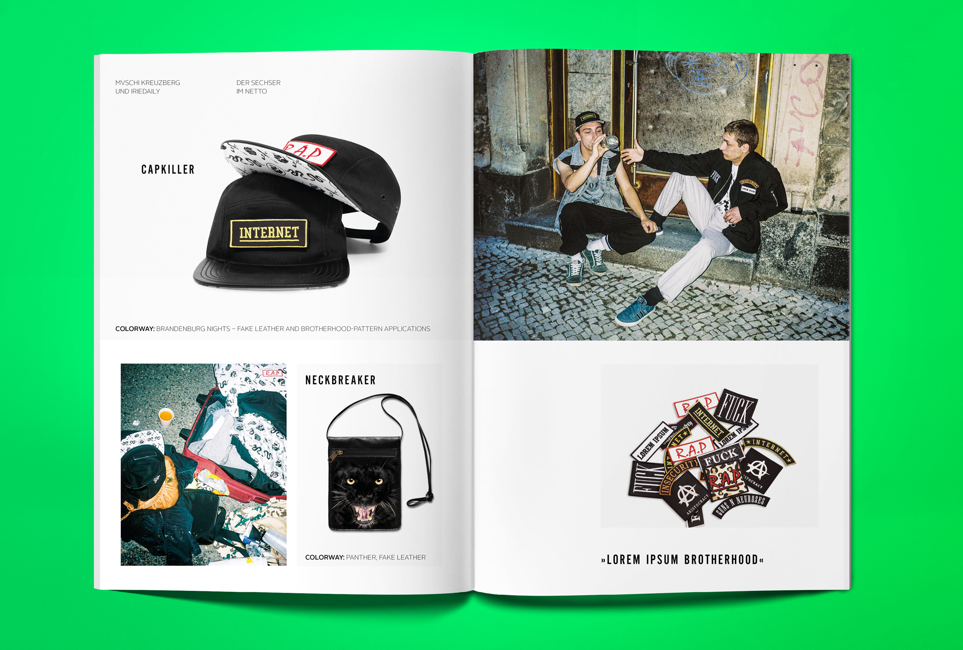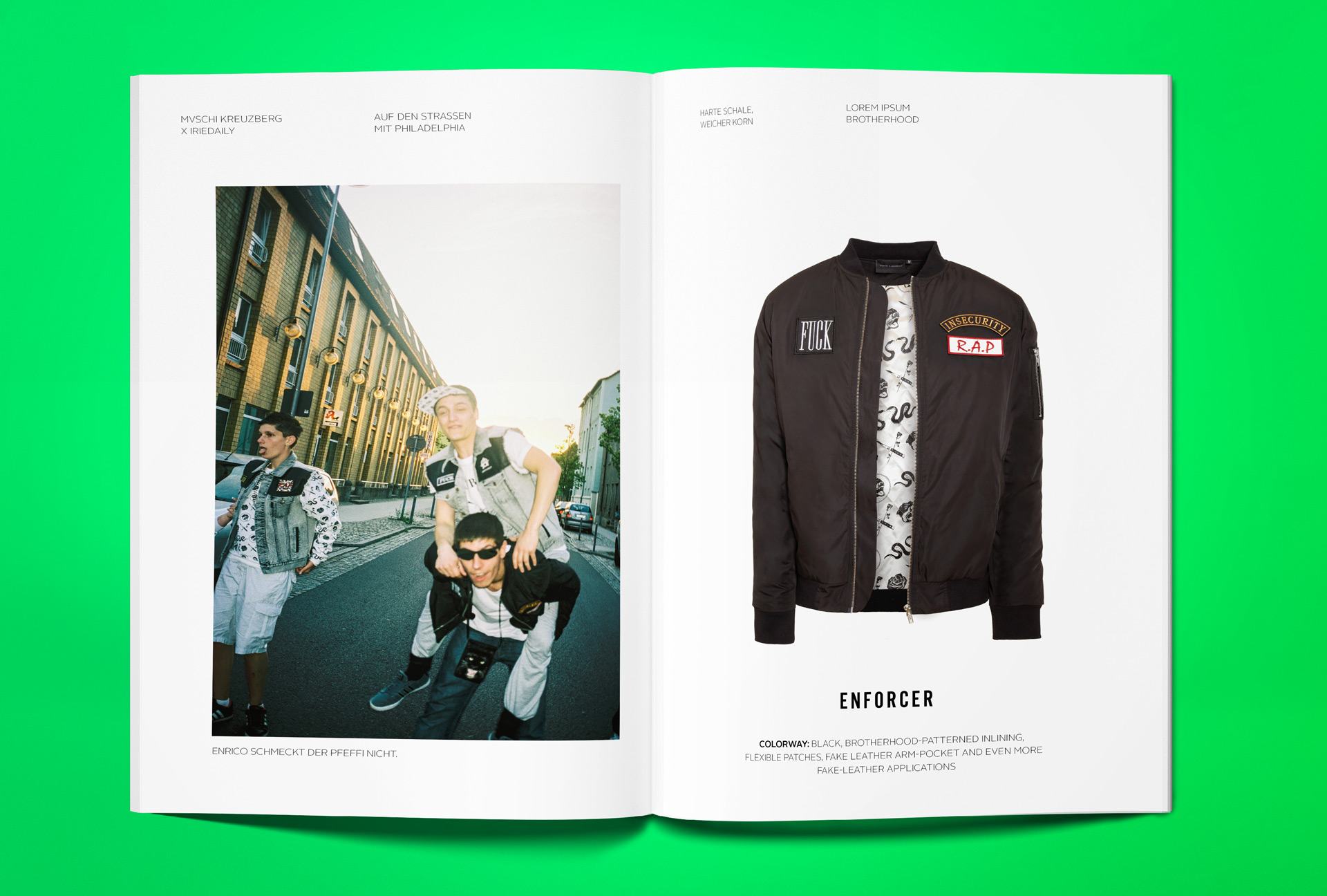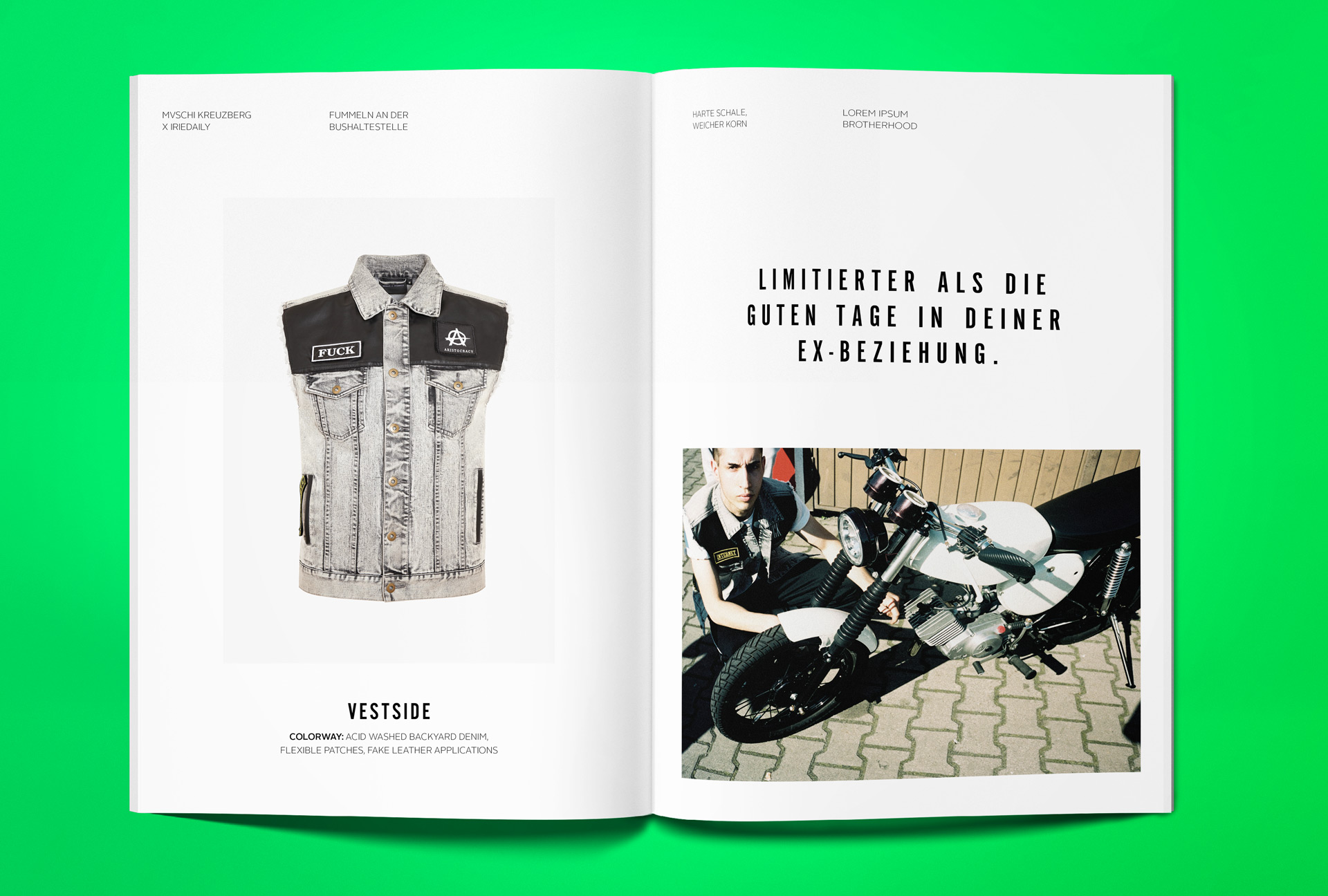 PM-Text : 7 Teile, die niemand braucht und jeder will – mit einer asphaltverherrlichenden Symbolik, völlig austauschbaren Motiven und einer auf Sellout getrimmten Aussage, die gnadenloser limitierter ist als die guten Tage deiner Ex-Beziehung. Neben den übermotiviert benannten Artikeln wie Rudeshirt, Alphasweat, Lifebeater und Neckbreaker stechen vor allem der Capkiller, Enforcer und die Vest Side tief ins Auge: Durch austauschbare Aufnäher lassen sie sich entsprechend der eigenen Identitätskrise variieren. Für MVSCHI war es das erste Mal mit wechselnden Patches – doch IRIEDAILY hielt geduldig seine schwitzende Hand über den kleinen Bruder. So konnte eine Modelinie entstehen, die sich wirklich gehen lassen kann.